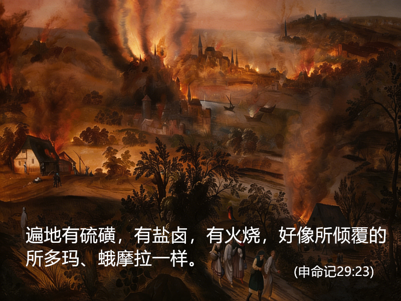 遍地有硫磺,有盐卤,有火烧,好像所倾覆的所多玛、蛾摩拉一样。(申命记29:23)